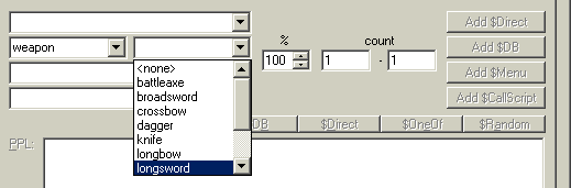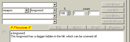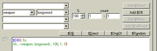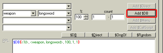 example: If you want to find out about "weapon/longsword" do the following: 1) Select "weapon" in the first box 2) Select "longsword" in the second box 3) make sure you have 100 % and two numbers in the three number boxes 4) Click into the PPI text field 5) Click on the $Add DB button |